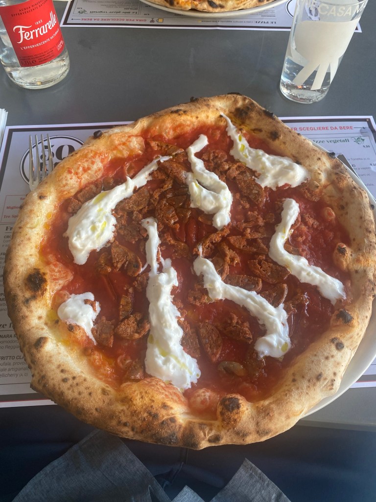 In Italy I ate at: I Masanielli di Francesco Martucci, I Masanielli di Sasà Martucci, Diego Vitagliano (Bagnoli), Diego Vitagliano (Santa Lucia), Seu Pizza Illuminati (Rome), 50 Kalò (Napoli), Pizzeria Salvo, and Starita. They were all very good or better. One thing that I found interesting is that every menu has a range of very crispy deep fried options (sometimes stuffed, sometimes sparsely topped—“montanara”-style) that seemed quite popular with locals. Setting aside the fried category, most margherita and marinara pizzas are soupy in the middle (as one expects) but at the very high end places a noticeable effort has been made to protect the light crispness of the crust all the way to the center. (Note that even at these “high end” places a margherita pizza is still around 8 bucks).