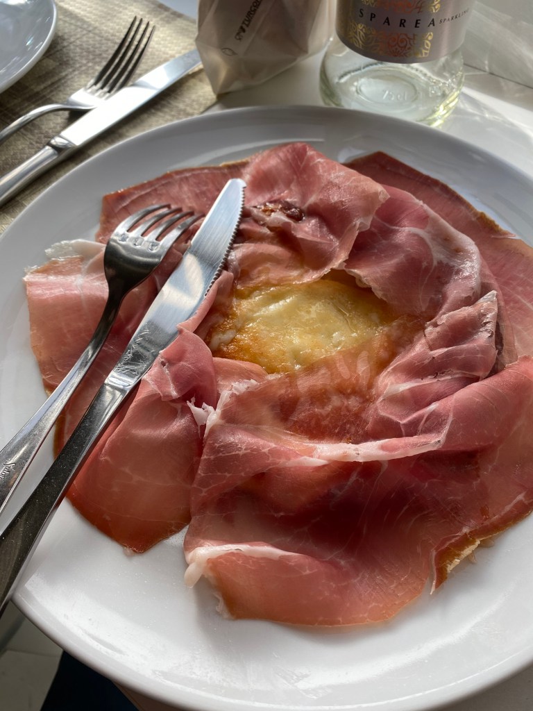 This sounded plausible to me in as far as I do believe that TripAdvisor and other online rating aggregators can tend to be reverse predictors, so I let him book us for Biassanot instead. But we also decided to walk over to Via Serra just before they opened and try to walk in for lunch. He was right about one thing (and only one thing): they were indeed booked out for weeks. But they keep four bar seats open for walk-ins and we were able to have lunch. Reader, it was tremendous. They served us some of the best food we had on the whole trip, and the rest of the menu was impressive (lots of snail symbols indicating the use of high-quality products certified by the Slow Food Alliance). Biassanot, on the other hand, was abjectly terrible (think lamb chops cut to very unevenly and served grey and well done, low quality charcuterie for premium prices, etc.). Biassanot was one of the most expensive meals we had the whole trip and easily the worst. To add insult to injury, we were seated next to a table of posh Brits who spent the meal pretending to know a lot about wine and repeatedly thanking each other for coming along on holiday.